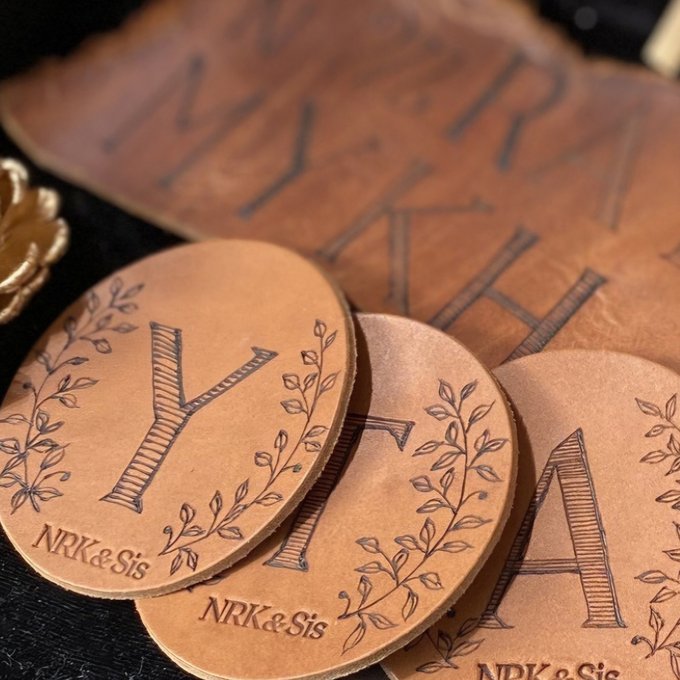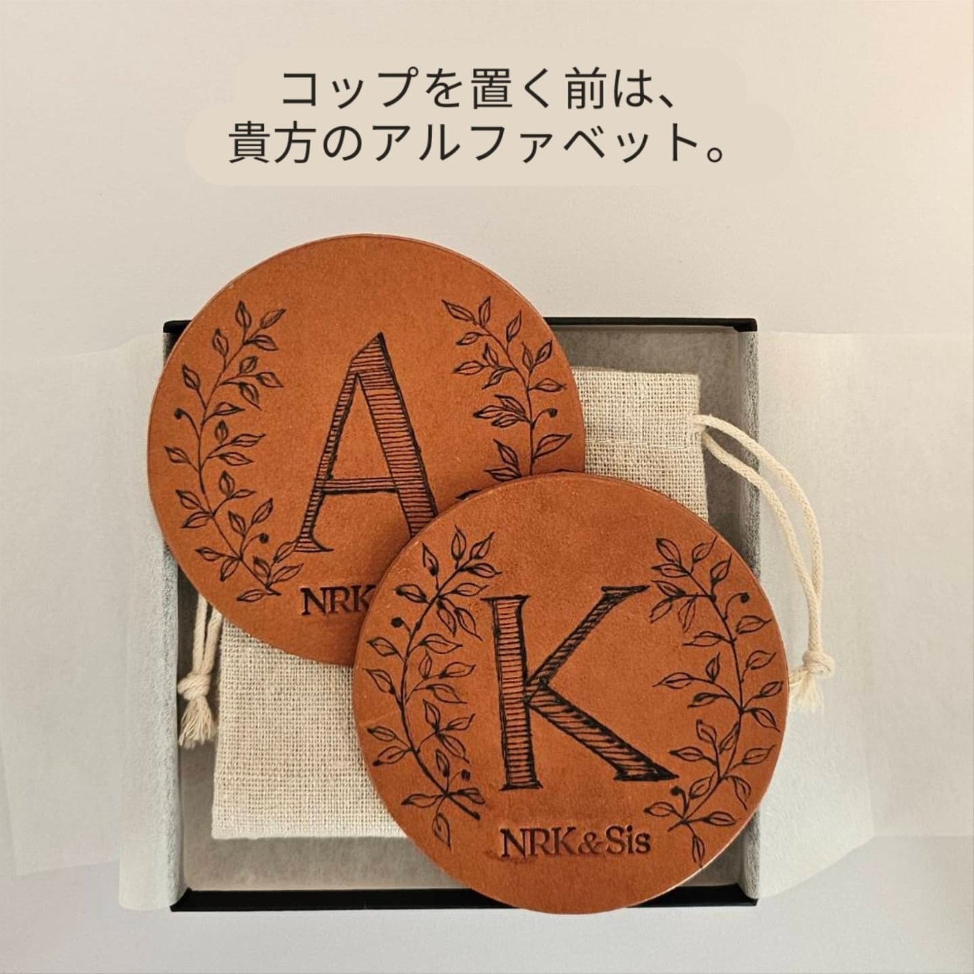1つ1つ焼きペンでアルファベットやツタの葉を描いており、他にはないオリジナルデザインのコースターです。