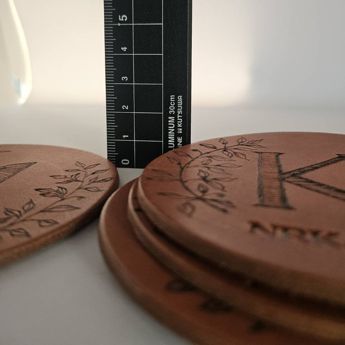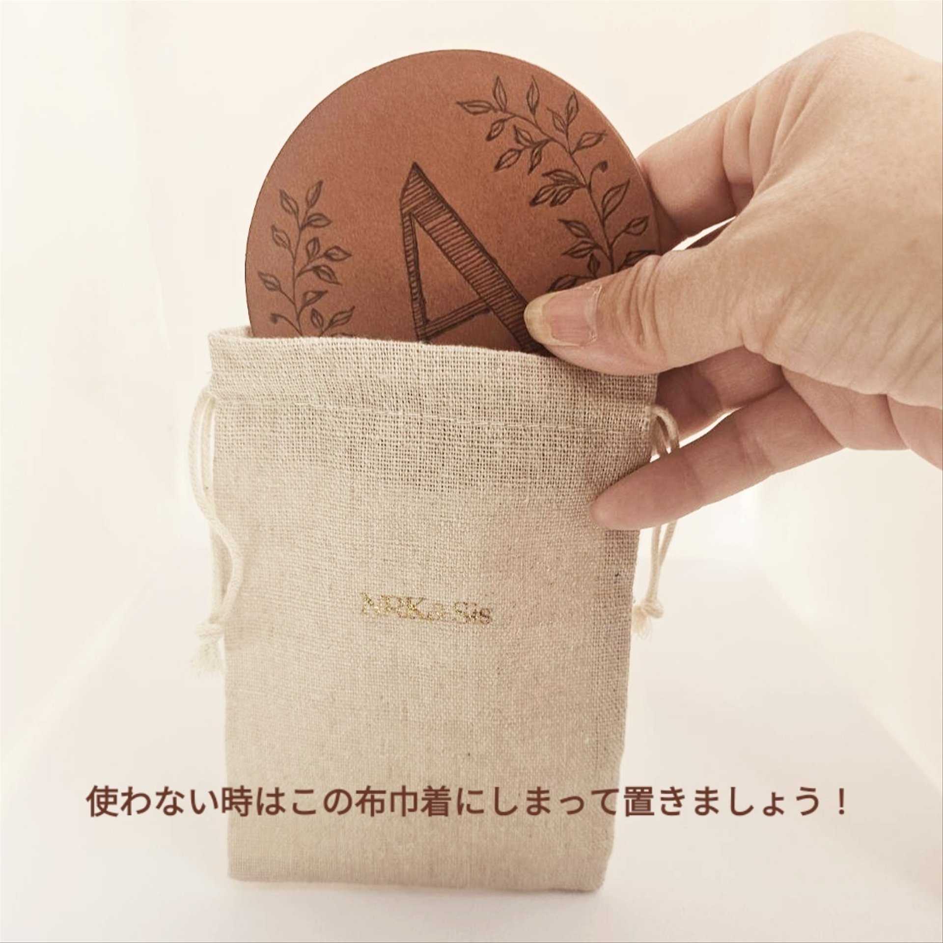 1つ1つ焼きペンでアルファベットやツタの葉を描いており、他にはないオリジナルデザインのコースター。