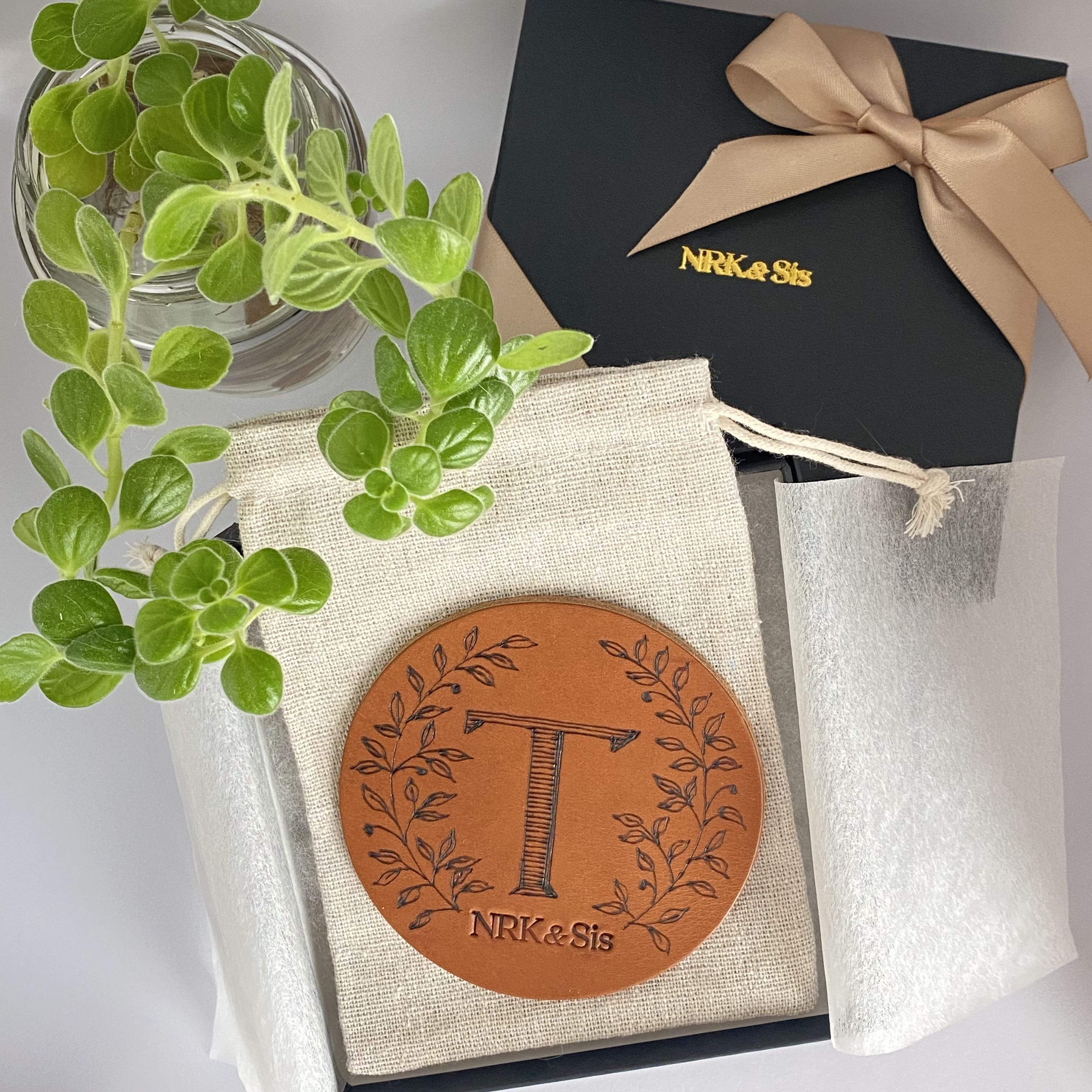 c. イニシャル & ツタの葉のコースター